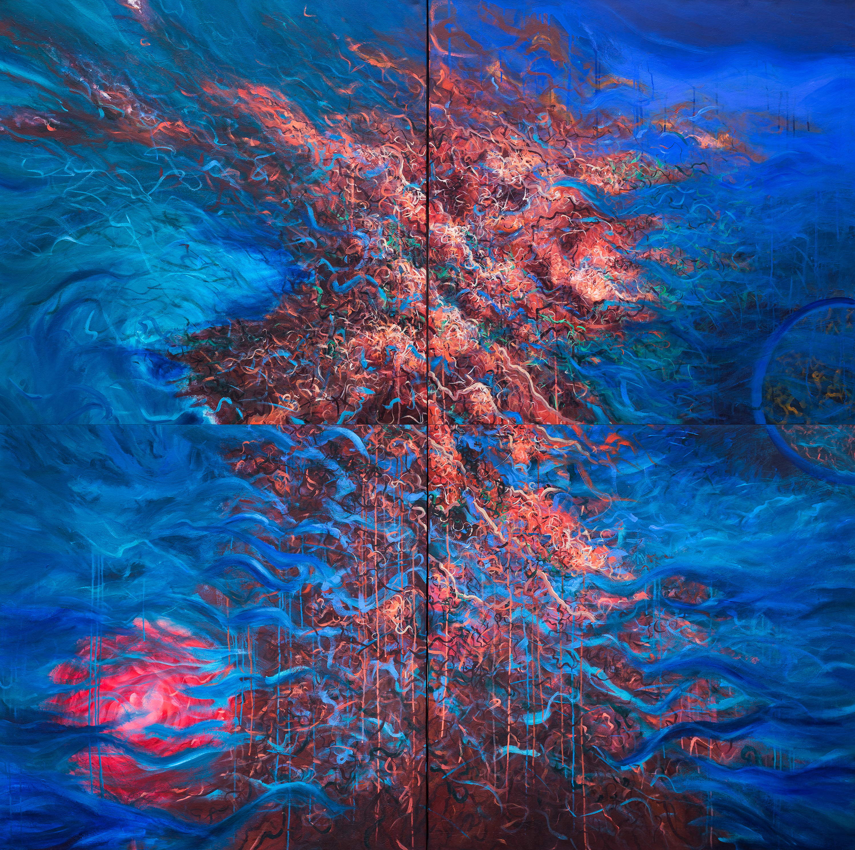 Shahnaz Sultana also talked about another large work titled Drishyaman Adrishya. Different shades of blue dominate the artwork and red and orange clouds cover most of the canvas.