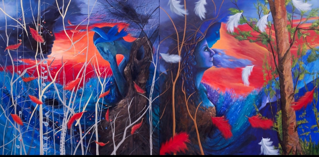 Creating art is one’s own mind….. suffering,love, neglect of society and inequality women’s suffering. All these are the story of this painting in the play of colors and lines. Drawing in my own world in silence and secrecy and here I find a new taste of the beauty of life. Sometimes crying, love, bitterness, pain, smiling again is an unknown fairy tale.